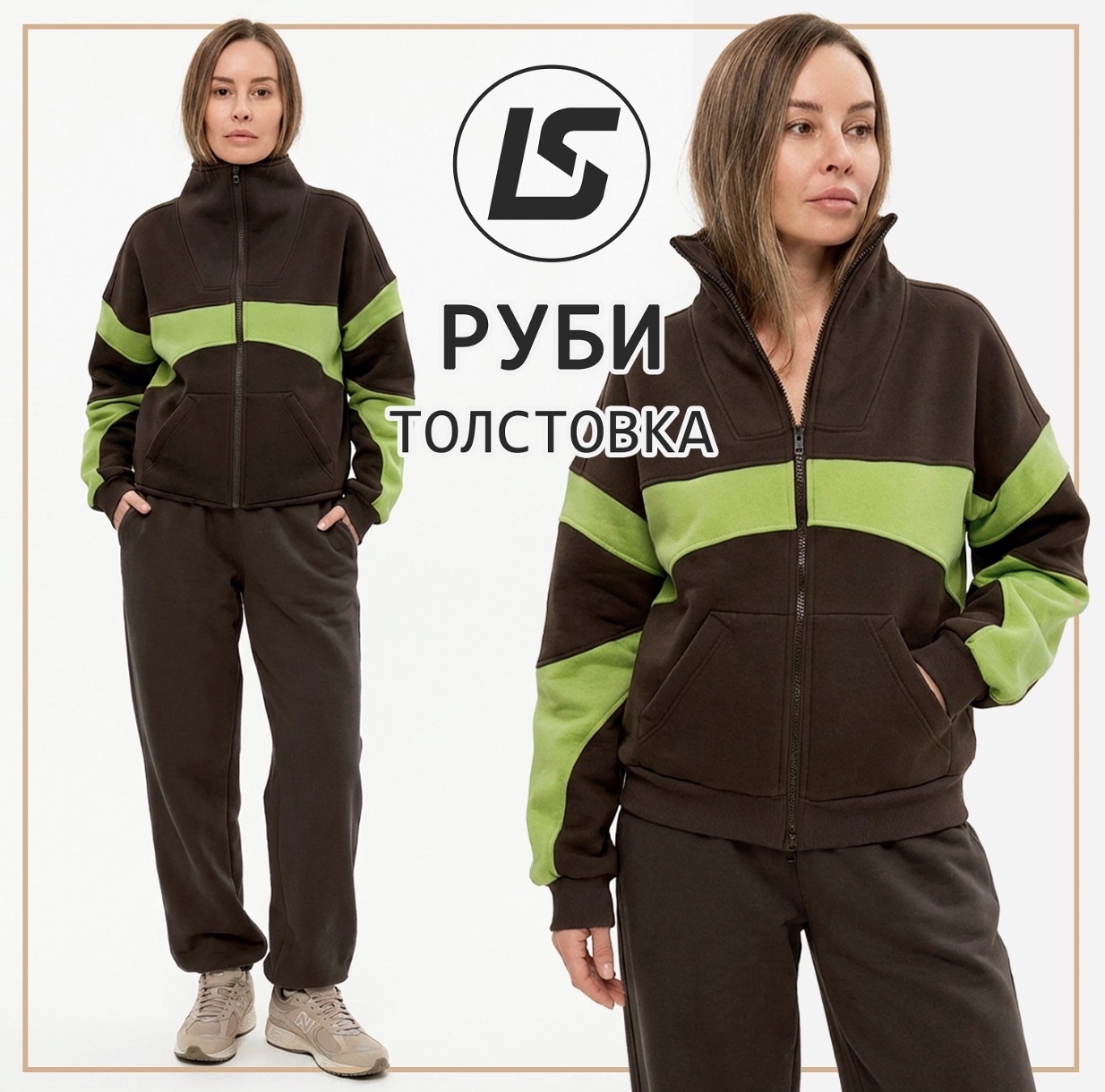 Модель умеренного объёма. Спереди имеются карманы «кенгуру». Рукав удлиненный, обработанный кашкорсе, как и низ изделия. Застежка на молнии. Вставки делают модель толстовки стильной и динамичной. Это хорошая возможность комбинировать между собой ткани разных фактур и цветов.