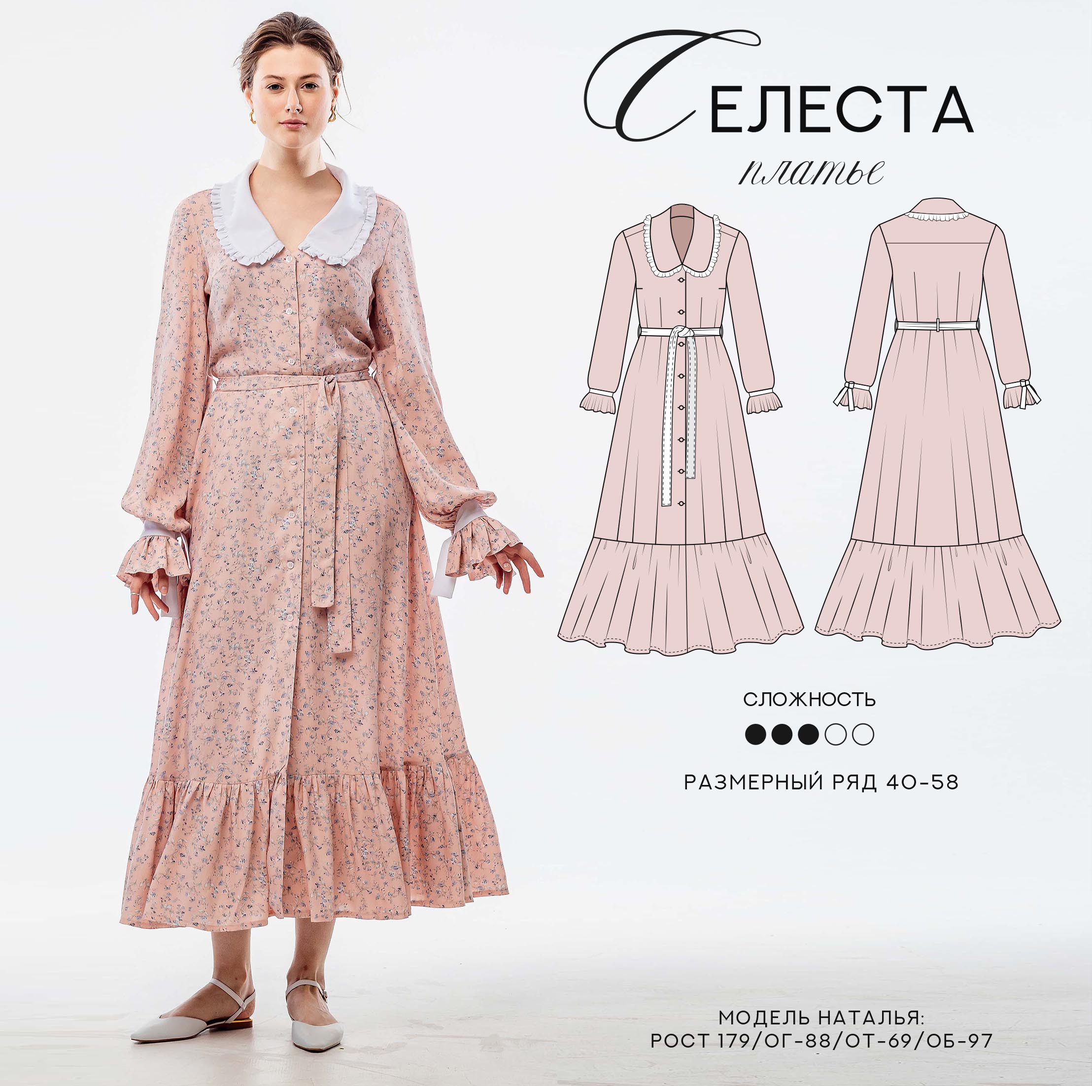 Платье прилегающего силуэта, отрезное по линии талии, длиной до щиколотки. На полочке — нагрудные и талиевые вытачки. По полочке центральная бортовая застежка на обметанные петли и пуговицы. Край борта обработан подбортом.