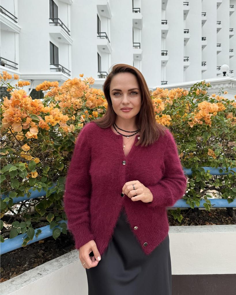 Кофта в цвете «Вишня» связана из пряжи Норка от Knitfashion, цвет М26, состав 80% пух